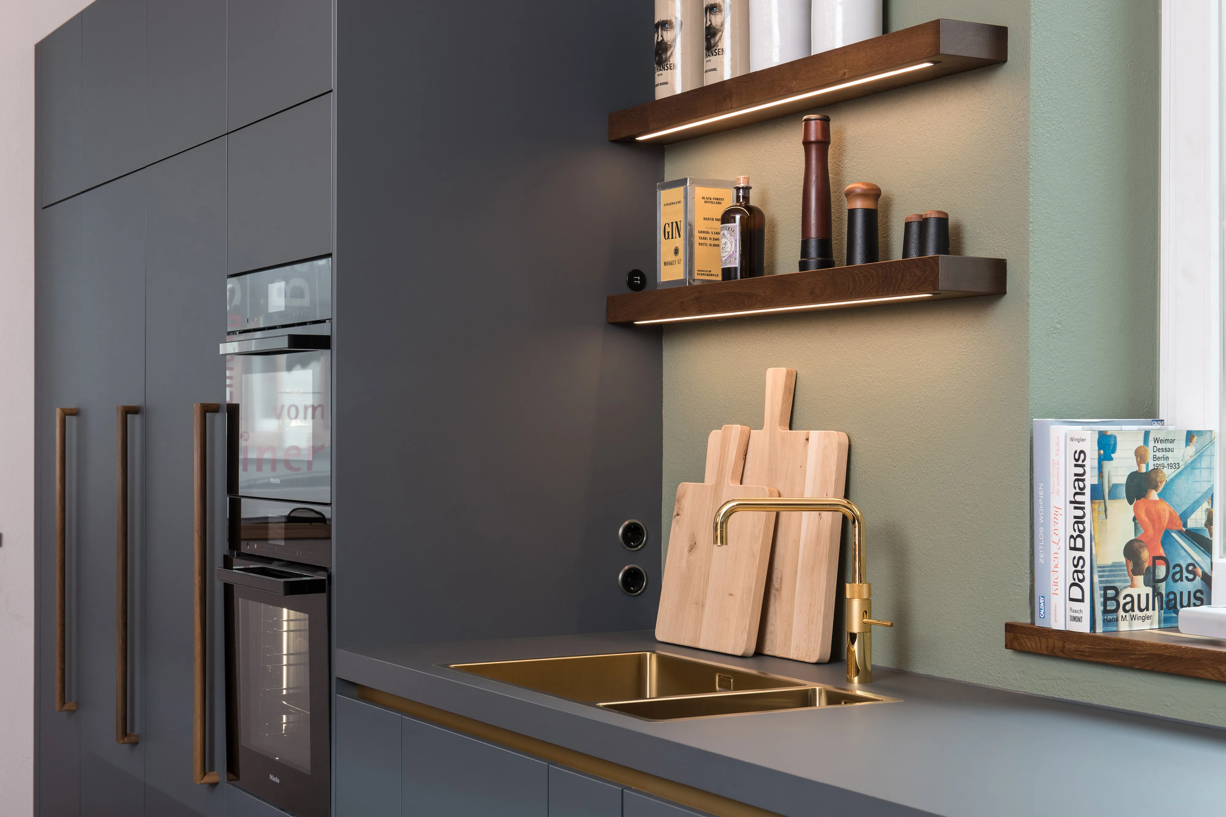 Dunkle Farben in einer Frankenhauser-Küche versprühen kontrastreiche Eleganz, dürfen sie mal den Ton angeben. Die extra abgestimmte Beleuchtung setzt edle Materialien gekonnt in Szene. Spielen goldfarbene Messing-Details oder natürliches Holz als Partner mit, wird das Gesamtbild zum Genuss mit Tiefenwirkung.